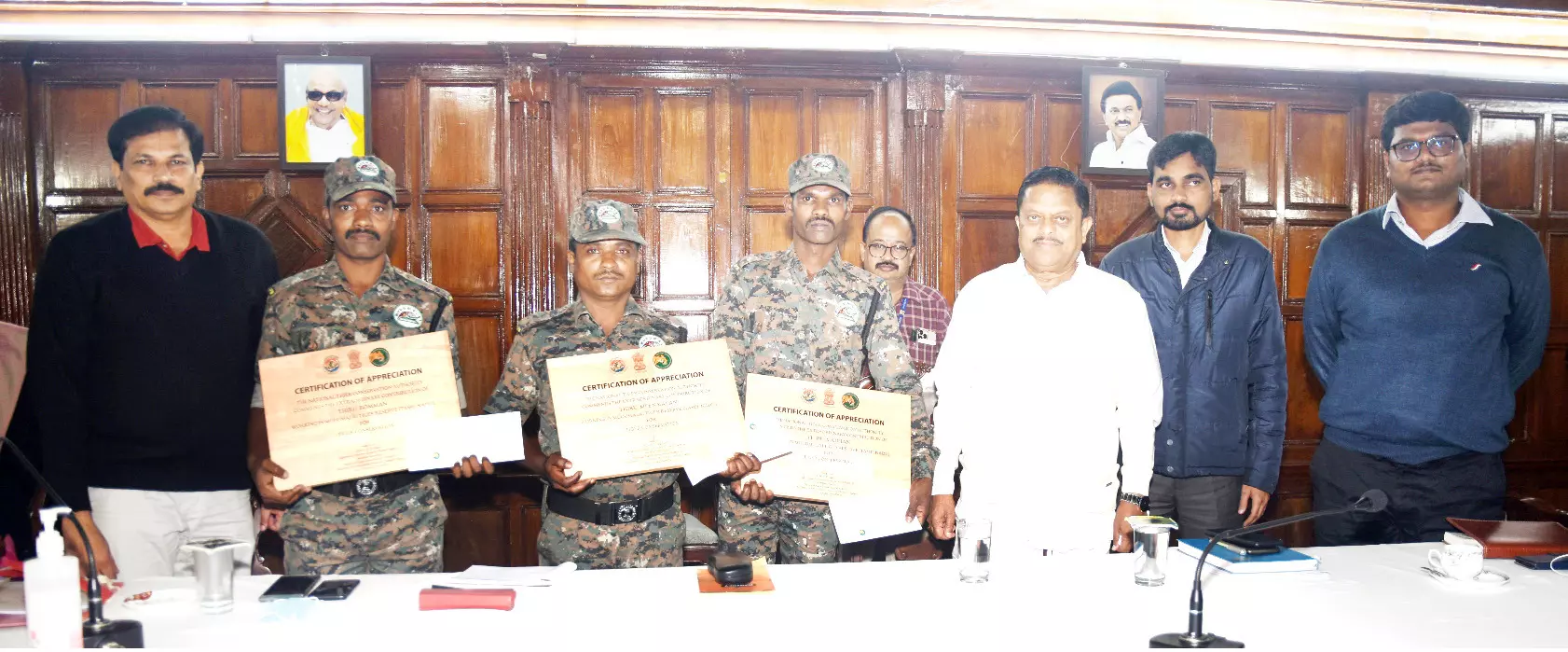 ഗൂഡല്ലൂർ: നീലഗിരി ജില്ലയിലെ നോർത്ത് സൗത്ത് ഫോറസ്റ്റ് ഡിവിഷൻ, മുതുമല കടുവ സങ്കേതം ഉൾപ്പെട്ട വനം വകുപ്പ് അധികൃതരുടെ അവലോകനയോഗം നടന്നു. വനം മന്ത്രി കെ.രാമചന്ദ്രൻ അധ്യക്ഷത വഹിച്ചു. വന്യമൃഗങ്ങളാൽ കൊല്ലപ്പെടുന്നവരുടെ ആശ്രിതർക്കുള്ള നഷ്ടപരിഹാരം ഉടൻ നൽകാനും പ്രതിരോധ നടപടികൾ സ്വീകരിക്കാനും മന്ത്രി ആവശ്യപ്പെട്ടു. അനധികൃതമായി സ്ഥാപിക്കുന്ന വൈദ്യുതി, സോളാർ വേലി കണ്ടെത്താൻ വനപാലകർ രഹസ്യ നിരീക്ഷണം നടത്തണം. കാട്ടാനകൾ നാട്ടിൻപുറങ്ങളിലേക്ക് ഇറങ്ങുന്നത് തടയാനുള്ള പ്രതിരോധ നടപടികളും സ്വീകരിക്കണം. മുതുമല കടുവ സങ്കേത ഡയറക്ടർ വെങ്കിടേഷ്, ഡെപ്യൂട്ടി ഡയറക്ടർമാരായ വിദ്യ, അരുൺ എന്നിവർ പങ്കെടുത്തു. ടി ട്വന്റി കടുവയെ ജീവനോടെ പിടികൂടാൻ സഹായിച്ച ആൻറി പോച്ചിംഗ് വാച്ചർമാരായ ബൊമ്മൻ, മാധൻ, മീങ്കാലൻ എന്നിവരെ അനുമോദിച്ചു. GDR AWARD :ടി ട്വന്റി കടുവയെ ജീവനോടെ പിടികൂടാൻ സഹായിച്ച ആന്റി പോച്ചിങ് വാച്ചർമാരായ ബൊമ്മൻ, മാധൻ, മീങ്കാലൻ എന്നിവരെ വനംമന്ത്രി കെ. രാമചന്ദ്രൻ അനുമോദിക്കുന്നു