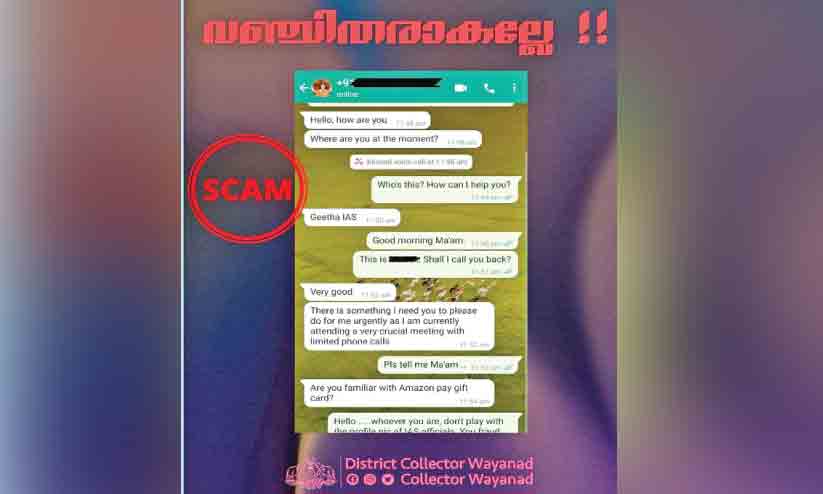 text_fieldsവയനാട് കലക്ടർ എ. ഗീതയുടെ ചിത്രം ഉപയോഗിച്ച് വ്യാജ വാട്സ് ആപ് അക്കൗണ്ടിലൂടെ പണം തട്ടാൻ ശ്രമിക്കുന്നതിന്റെ സ്ക്രീൻഷോട്ട്