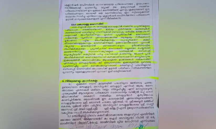 പ്രവൃത്തികള്ക്ക് സാങ്കേതികാനുമതി, ടെന്ഡര് നടപടിക്രമങ്ങള് കരാര് തുടങ്ങി യാതൊന്നും നിഷ്കര്ഷിക്കുന്ന പ്രകാരം നടത്തിയിട്ടില്ല. പദ്ധതിക്കാവശ്യമായ സാധനസാമഗ്രികള് വാങ്ങുന്നത് സംബന്ധിച്ച് പ്രൊക്യൂര്മെന്റ് കമ്മിറ്റിയില് ഒരു ചര്ച്ചയും നടത്തിയിട്ടില്ല. ഇതിനെല്ലാം നേതൃത്വം നല്കേണ്ട ഭരണസമിതി ഉത്തരവാദത്വ നിർവഹണം നടത്തിയില്ലെന്നും റിപ്പോര്ട്ടിലുണ്ട്. പദ്ധതിയുമായി ബന്ധപ്പെട്ട് ഭരണസമിതി അംഗങ്ങള്ക്ക് കൂടുതല് പരിശീലനം നല്കണമെന്നും റിപ്പോര്ട്ടില് സൂചിപ്പിക്കുന്നു. റിപ്പോർട്ടിലെ പരാമർശങ്ങൾ പുറത്തുവന്നതോടെ ഭരണ സമിതി ആരോപണങ്ങൾക്ക് മറുപടി പറയേണ്ട സ്ഥിതിയിലാണ്.