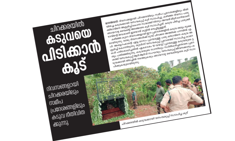 text_fieldsമാനന്തവാടി: നഗരസഭ പരിധിയിലെ ചിറക്കരയിലും സമീപ പ്രദേശങ്ങളിലും ഭീതിവിതച്ച കടുവക്കായി കൂടൊരുക്കി 10 ദിവസമായെങ്കിലും കടുവ കൂട്ടിൽകയറിയില്ല. ഇത് വനപാലകരെയും നാട്ടുകാരെയും ഒരുപോലെ വട്ടംചുറ്റിക്കുന്നു. കടുവയെ പിടികൂടുന്നതിനായി ഈ മാസം 12ന് വൈകീട്ടാണ് കൂട് സ്ഥാപിച്ചത്. കനത്ത വേനല് മഴ തുടരുന്നതിനാല് കടുവയുടെ കാൽപാടുകളും മറ്റും വനപാലക സംഘത്തിന് കണ്ടെത്താന് കഴിയാത്തതും തിരിച്ചടിയാണ്. ദിവസങ്ങള്ക്ക് മുമ്പ് തലപ്പുഴ ഗോദാവരി ഭാഗത്ത് കടുവയുടെ കാൽപാട് കണ്ടതായി പ്രദേശവാസികള് അറിയിച്ചതനുസരിച്ച് വനംവകുപ്പ് നടത്തിയ പരിശോധനയില് ഗോദാവരി മുതല് ചിറക്കര എണ്ണപ്പന വരെയുള്ള നാല് സ്ഥലത്ത് കടുവയുടെ കാല്പാട് കണ്ടെത്തിയിരുന്നു.
