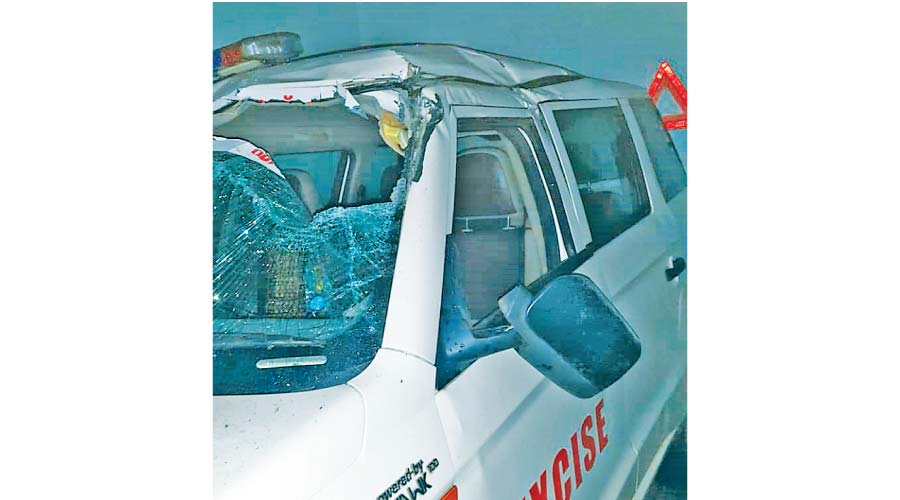എക്സൈസ് ഉദ്യോഗസ്ഥർ സഞ്ചരിച്ച വാഹനം കാട്ടാന കൊമ്പിൽ കോർത്തു; യാത്രികർ രക്ഷപ്പെട്ടത് തലനാരിഴക്ക്
