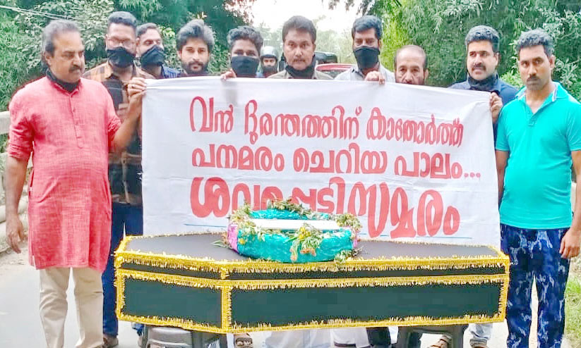 പാലവും റോഡുകളും തകർന്നു; ശവപ്പെട്ടി സ്ഥാപിച്ച് നാട്ടുകാരുടെ പ്രതിഷേധം