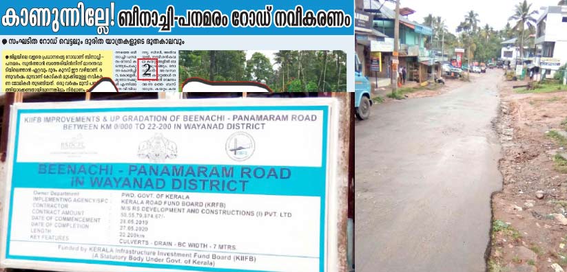 text_fieldsബീനാച്ചി-പനമരം റോഡ് പണി തുടങ്ങിയേപ്പാൾ അധികൃതർ പനമരം ടൗണിനടുത്ത് സ്ഥാപിച്ച ബോർഡ് (ഫയൽ ചിത്രം), 2. നവീകരണം തുടങ്ങാത്ത നടവയൽ ടൗണിനടുത്തെ ഭാഗം