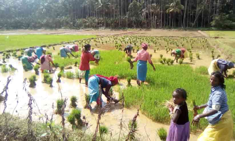 മൊതകര വയലിലെ നാട്ടിപ്പണിയിൽ ഏർപ്പെട്ടിരിക്കുന്ന ആദിവാസി അമ്മമാർ
