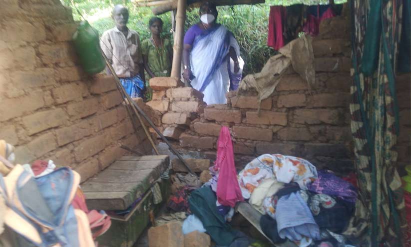 ചേരമ്പാടി കുളിവയൽ ആദിവാസി കോളനിയിലെ കാട്ടാന തകർത്ത വീട് പഞ്ചായത്ത് പ്രസിഡൻറ് ലില്ലി ഏലിയാസ് സന്ദർശിക്കുന്നു