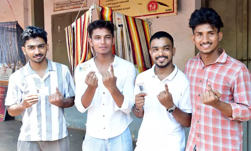 യുവാക്കളിലാണ് പ്രതീക്ഷ.... കണ്ണൂർ തോട്ടട ഗവ. ഹയർ സെക്കൻഡറി സ്കൂളിലെ ബൂത്തിൽ വോട്ട് രേഖപ്പെടുത്തിയ ശേഷം ചൂണ്ടുവിരലിലെ മഷി ഉയർത്തിക്കാട്ടുന്ന യുവ വോട്ടർമാർ