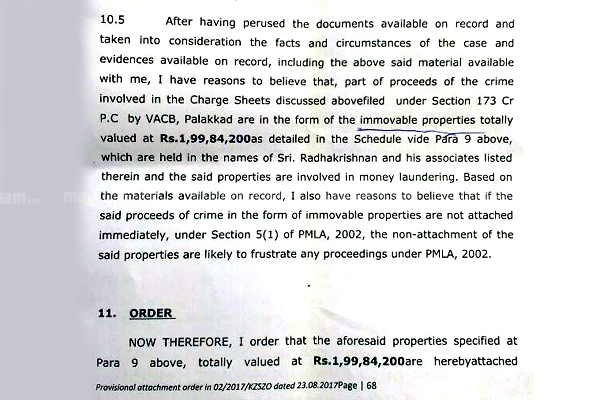 2004 മുതൽ 2008 വരെ മലബാർ സിമൻറ്സിൽ നടന്ന സാമ്പത്തിക ക്രമക്കേടുമായി ബന്ധപ്പെട്ടാണ് സ്വത്ത് കണ്ടുകെട്ടൽ നടപടി. ഇതിന് മുന്നോടിയായി രാധാകൃഷ്ണന്റെ സ്വത്തുക്കളെ കുറിച്ചുള്ള വിവരങ്ങൾ എൻഫോഴ്സ്മെന്റ് ഡയറക്ടറേറ്റ് കോഴിക്കോട് വിഭാഗം ശേഖരിച്ച് ഡൽഹി വിഭാഗത്തിന് കൈമാറിയിരുന്നു. നേരത്തെ രാധാകൃഷ്ണെൻറയും അദ്ദേഹത്തിെൻറ ബിനാമികളുടെയും പേരിലുള്ള വീടുകളിലും സ്ഥാപനങ്ങളിലും ഇ.ഡി ഉദ്യോഗസ്ഥർ റെയ്ഡ് നടത്തിയിരുന്നു.