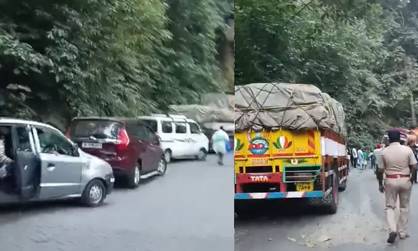 സംസ്ഥാന അതിർത്തിക്ക് സമീപം വലിയ കയറ്റത്തിലാണ് ലോറി മറിഞ്ഞത്. ഇതോടെ വാഹനങ്ങൾക്ക് ഇരു വശത്തേക്കും പോകാൻ സാധിക്കാതായി. ചുരത്തിലുടനീളം വൻ ഗതാഗതക്കുരുക്കാണ് അനുഭവപ്പെട്ടത്. പൊലീസ് സ്ഥലത്തെത്തി.
