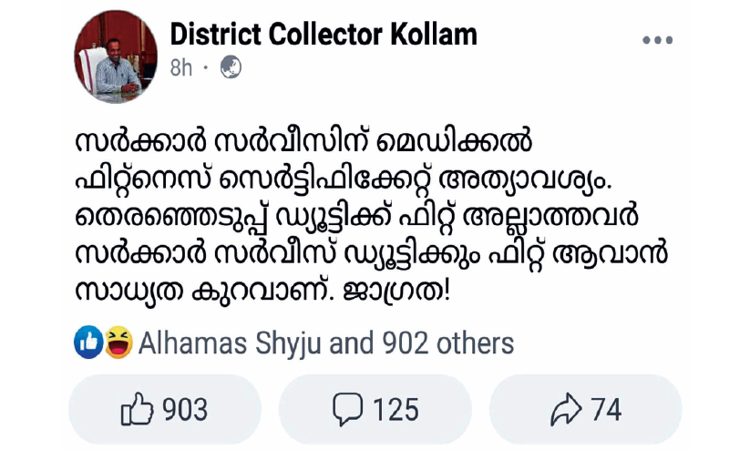 text_fieldsകൊല്ലം കലക്ടറുടെ ഫേസ്ബുക്ക് പോസ്റ്റ്