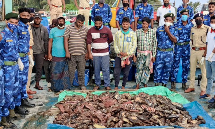 ഇവർ കൊന്ന 486 കടൽ വെള്ളരികളും രണ്ട് മത്സ്യബന്ധന ബോട്ടുകളും കസ്റ്റഡിയിലെടുത്തു. തിരുവനന്തപുരം സ്വദേശി പി.സാജൻ, ലക്ഷദ്വീപിലെ അഗത്തി സ്വദേശികളായ അബ്ദുൽ ജബ്ബാർ, എസ്.ബി. മുഹമ്മദ് ഹഫീൽ, സഖലൈൻ മുസ്താഖ്, തമിഴ്നാട് കന്യാകുമാരി സ്വദേശി പി.ജൂലിയസ് നായകം, സൗത്ത് ഡൽഹിക്കാരനായ ജഗൻ നാഥ് ദാസ്, പശ്ചിമബംഗാൾ സ്വദേശി പരൺ ദാസ് എന്നിവരാണ് പിടിയിലായത്.