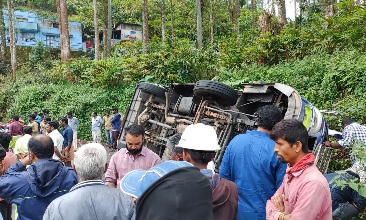 തോണ്ടിമല ഇറച്ചിപ്പാറയ്ക്കു സമീപത്തെ എസ് വളവിൽ വച്ച് ബസിന്റെ ബ്രേക്ക് നഷ്ടമായതോടെ റോഡിൽ തന്നെ മറിയുകയായിരുന്നു. ബന്ധുക്കളും സുഹൃത്തുക്കളുമായ 17 പേരാണ് വാഹനത്തിലുണ്ടായിരുന്നത്. പരുക്കേറ്റവരുടെ നില ഗുരുതരമല്ല. ഇവരെ രാജകുമാരിയിലെ സ്വകാര്യ ആശുപത്രിയിൽ പ്രവേശിപ്പിച്ച് പ്രാഥമിക ചികിത്സ നൽകിയ ശേഷം തേനി മെഡിക്കൽ കോളജിലേക്ക് കൊണ്ടു പോയി.