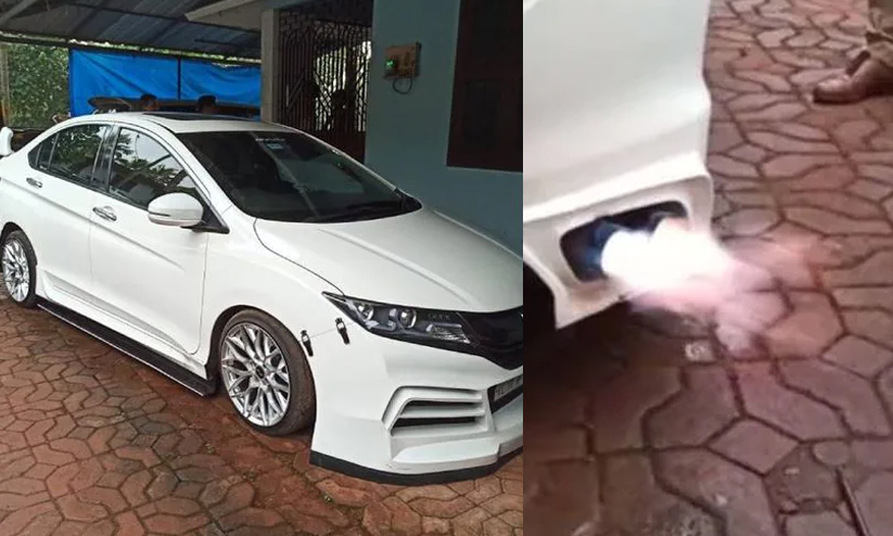 കോളജുകളില് അടക്കം ആഘോഷ പരിപാടികള്ക്ക് നല്കിയിരുന്ന കാറാണ് മോട്ടോര് വാഹന വകുപ്പ് പൊക്കിയത്. ഹോണ്ട സിറ്റി കാറാണ് രൂപമാറ്റം വരുത്തിയും സൈലൻസറിൽ നിന്ന് തീ തുപ്പുന്ന സംവിധാനമൊരുക്കിയും നിയമലംഘനം നടത്തിയത്.