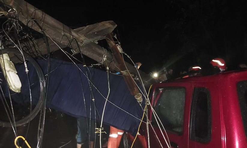 ഓടുന്ന കാറിനുമുകളിൽ വൈദ്യുതി തൂൺ വീണു; യാത്രക്കാർ അത്ഭുതകരമായി രക്ഷപ്പെട്ടു