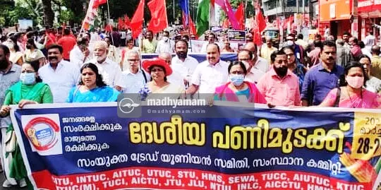 തിരുവനന്തപുരം: തൊഴിലാളി വിരുദ്ധ ലേബർ കോഡുകൾ പിൻവലിക്കുക, കർഷകരുടെ ആറ് ആവശ്യങ്ങൾ അടങ്ങിയ അവകാശപത്രിക ഉടൻ അംഗീകരിക്കുക തുടങ്ങി 12 ആവശ്യങ്ങൾ ഉന്നയിച്ച് ട്രേഡ് യൂനിയൻ സംയുക്ത സമിതി പ്രഖ്യാപിച്ച ദ്വിദിന ദേശീയ പണിമുടക്ക് തുടങ്ങി. ഞായറാഴ്ച രാത്രി 12 മുതൽ ചൊവ്വാഴ്ച രാത്രി 12 വരെയാണ് പണിമുടക്ക്. കേരളത്തിൽ 22 തൊഴിലാളി സംഘടനകളാണ് പണിമുടക്കുന്നത്. ആശുപത്രി, ആംബുലൻസ്, മരുന്നുകടകൾ, പാൽ, പത്രം, ഫയർ ആന്ഡ് റെസ്ക്യൂ പോലുള്ള അവശ്യ സർവിസുകളെ ഒഴിവാക്കിയിട്ടുണ്ട്. റെയിൽവേ മേഖലയെ പണിമുടക്കിൽ ഉൾപ്പെടുത്തിയിട്ടില്ല. പക്ഷേ യാത്ര ഒഴിവാക്കണമെന്ന് സംയുക്ത സമിതി അഭ്യർഥിച്ചിട്ടുണ്ട്.