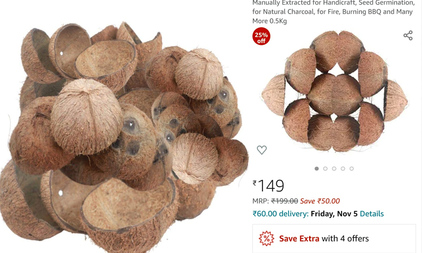 കിലോക്ക് 199 രൂപ, 40 എണ്ണത്തിന് 140 രൂപ, 75 എണ്ണത്തിന് 250 രൂപ, 4കിലോക്ക് 315രൂപ എന്നിങ്ങനെ വ്യത്യസ്ത ഓഫറുകളുമായി വേറെയും കമ്പനികൾ ആമസോണിൽ ചിരട്ടക്കച്ചവടം പൊടിപൊടിക്കുന്നുണ്ട്.