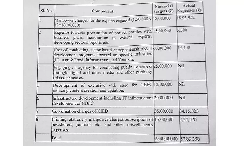 പ്രോജക്ട് പ്രൊഫൈലുകൾ തയാറാക്കുന്നതിനുള്ള ചെലവ് (ബിസിനസ് പ്ലാനുകൾ, ബാഹ്യ വിദഗ്ധർക്കുള്ള പ്രതിഫലം, റിപ്പോർട്ടുകൾ മുതലായവ വികസിപ്പിക്കുന്നതിന്) 15 ലക്ഷം അനുവദിച്ചതിൽ 5,500 രൂപയാണ് ചെലവഴിച്ചത്.