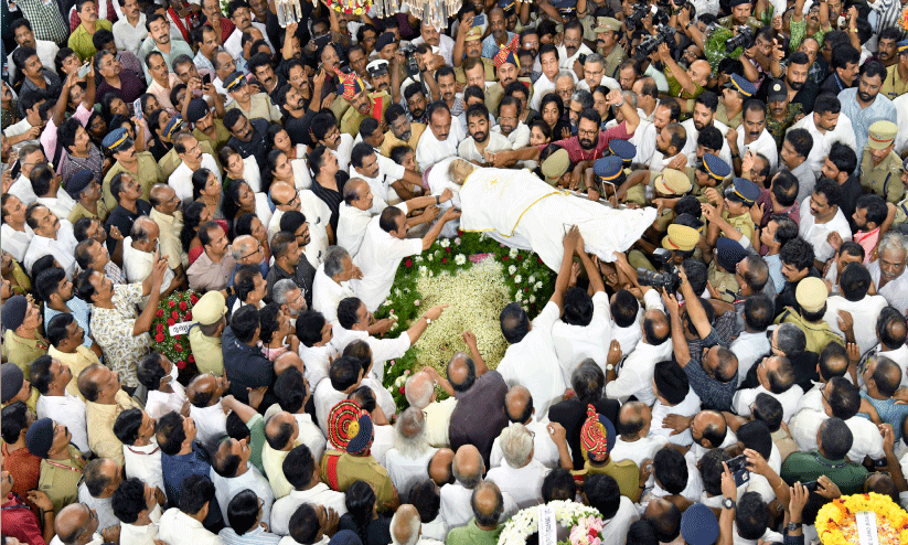 ഉമ്മൻ ചാണ്ടി ദർബാർ ഹാളിൽ എത്തിയപ്പോൾ പതിവുപോലെ ഒന്നിനുമുണ്ടായിരുന്നില്ല ഒരു ചിട്ടയും. ഇന്നലെയും ആളുകൾ ആൾക്കടലായി തിക്കിത്തിരക്കി. ‘‘ഉമ്മൻ ചാണ്ടി നേതാവേ, കണ്ണേ കരളേ കുഞ്ഞൂഞ്ഞേ, ആര് പറഞ്ഞു മരിച്ചെന്ന്, ജീവിക്കുന്നൂ ഞങ്ങളിലൂടെ’’..എന്നാർത്തലച്ചു. ഒരു നോക്കുകാണാൻ അത്രയും മോഹിച്ചാണ് ഓരോരുത്തരും വന്നണഞ്ഞതെന്ന് കരഞ്ഞുവീർത്ത മുഖം വിളിച്ചോതി. ഭാര്യ മറിയാമ്മ ഉമ്മനും മക്കളായ അച്ചു ഉമ്മനും ചാണ്ടി ഉമ്മനും മറിയ ഉമ്മനും തിരക്ക് വകവെക്കാതെ തലപ്പുറത്തുനിന്നു.