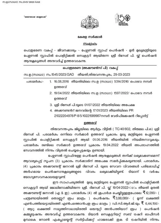 മുഖ്യമന്ത്രിയുടെ മുൻ പൊളിറ്റിക്കൽ സെക്രട്ടറിക്ക് പെൻഷനും 10 ലക്ഷത്തിന്റെ ആനുകൂല്യത്തിനും ഉത്തരവ്