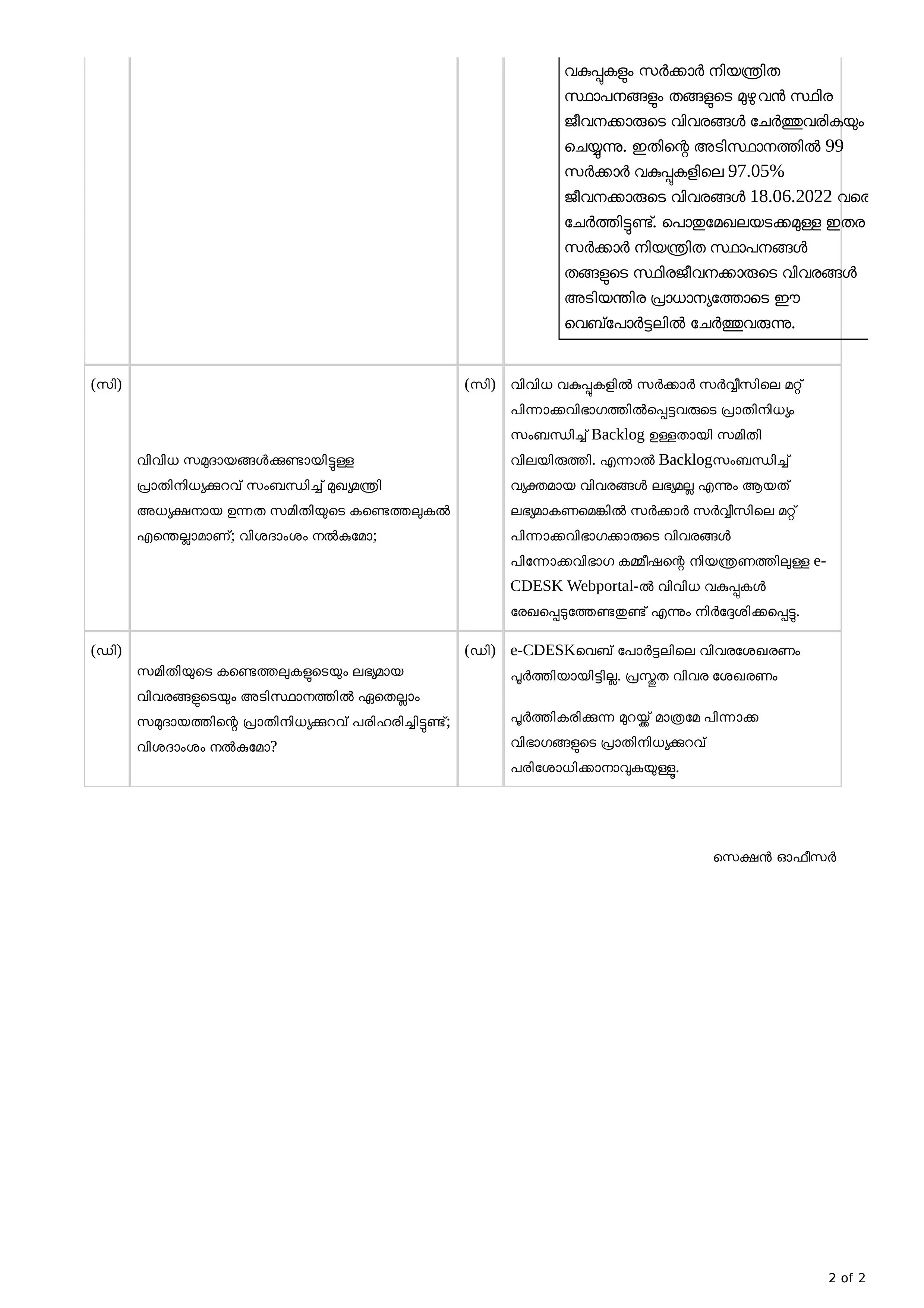 എല്ലാ സർക്കാർ വുകുപ്പുകളും സർക്കാർ നിയന്ത്രിത സ്ഥാപനങ്ങളും മുഴുവൻ സ്ഥിര ജീവനക്കാരുടെ വിവരങ്ങൾ പോർട്ടിൽ ചേർക്കുന്നുണ്ട്. നിലവിൽ 99 സർക്കാർവകുപ്പികളിലെ 97.05 ശതമാനം ജീവനക്കാരുടെ വിവരങ്ങൾ 2022 ജൂൺ 18 വരെ ശേഖരിക്കാൻ കഴിഞ്ഞു. പൊതുമേഖലയടക്കമുള്ള ഇതര സർക്കാർ സർക്കാർ നിയന്ത്രിത സ്ഥാപനങ്ങൾ തങ്ങളുടെ സ്ഥിരജീവനക്കാരുടെ വിവരങ്ങൾ അടിയന്തിര പ്രാധാന്യത്തോടെ വെബ് പോർട്ടിൽ ചേർക്കണെമന്നും നിർദേശം നൽകി. വിവരശേഖരം പൂർത്തീകരിക്കുന്നതോടെ മറ്റ് പിന്നോക്ക വിഭാഗങ്ങളുടെ കുറവ് കണ്ടെത്താനാവുമെന്നും പി.ഉബൈദുള്ളക്ക് രേഖാമൂലം മറുപടി നൽകി.