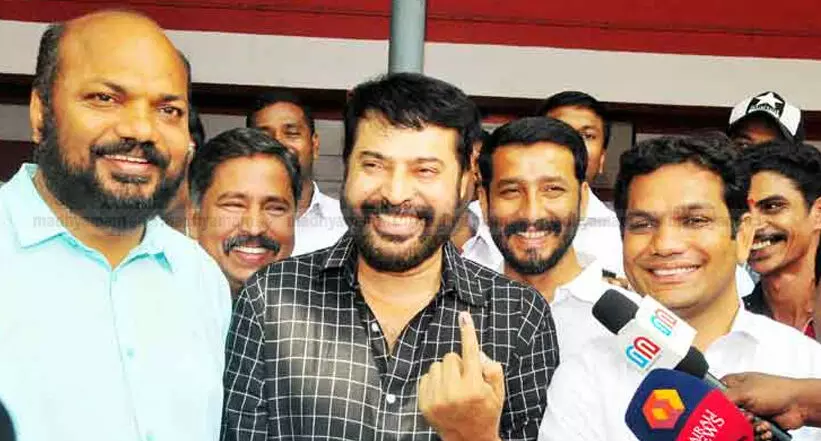 കഴിഞ്ഞ ലോക്സഭാ തെരഞ്ഞെടുപ്പിൽ വോട്ട് ചെയ്ത ശേഷം മഷിപുരട്ടിയ വിരൽ കാണിക്കുന്ന മമ്മൂട്ടി