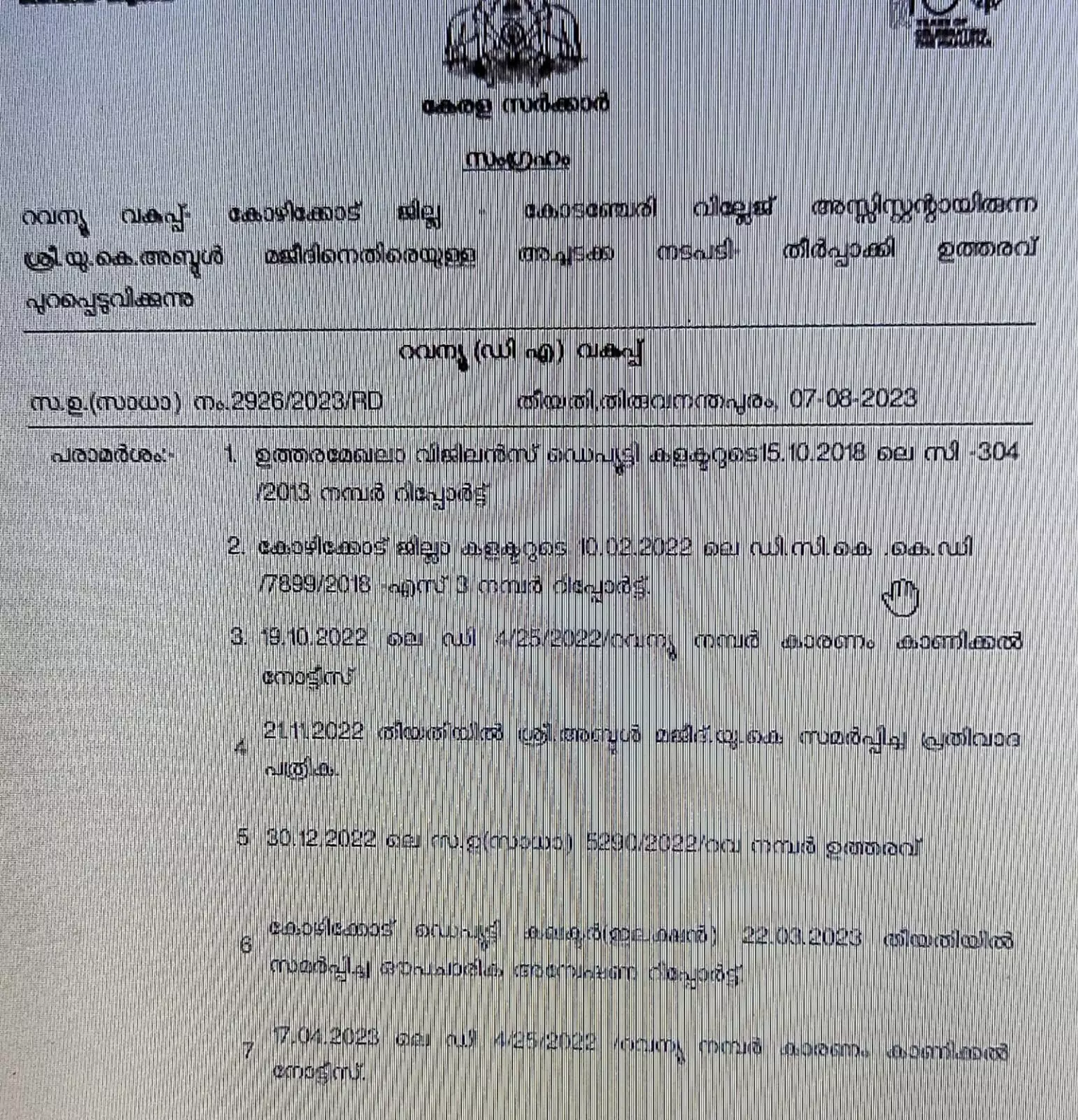 മേലുദ്യോഗസ്ഥരുടെ അനുമതി ഇല്ലാതെയും ഭൂമിയുടെ ഉടമസ്ഥാവകാശം, കൈവശം എന്നിവ പരിശോധിക്കാതെയുമാണ് നികുതി അടച്ചുകൊടുത്തതെന്ന് റിപ്പോർട്ട് നൽകി. തുടർന്ന് നടപടിക്രമങ്ങളുടെ ഭാഗമായി വകുപ്പിലെ അണ്ടർസെക്രട്ടറി 2023 ജൂലൈ 25ന് അബ്ദുൽ മജീദിനെ നേരിൽ കേട്ടു. അതിനുശേഷമാണ് റവന്യൂവകുപ്പ് ഉത്തരവിട്ടത്.