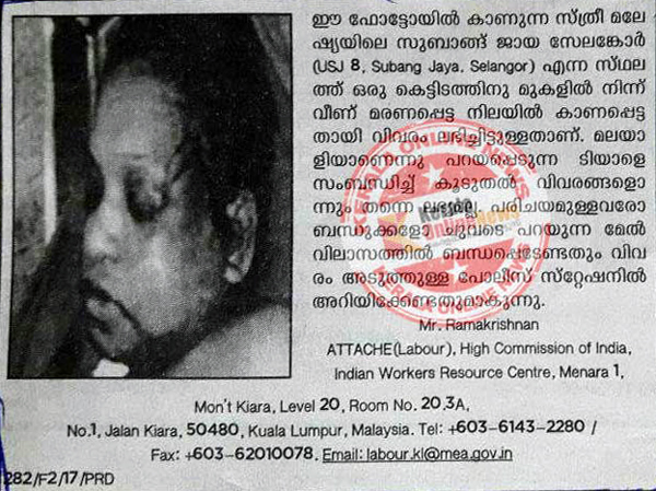 text_fieldsപയ്യന്നൂർ: മലേഷ്യയിലെ സുബാങ് ജായ സേലങ്കോറിൽ കെട്ടിടത്തിൽ നിന്ന് വീണുമരിച്ച നിലയിൽ കണ്ടെത്തിയ സ്ത്രീ കാമുകനെ വെട്ടിനുറുക്കി സൂട്ട്കെയ്സുകളിലാക്കിയ പയ്യന്നൂരിലെ ഡോ. ഓമനയാണെന്ന് സംശയം. ബുധനാഴ്ച മലേഷ്യൻ ഹൈകമീഷണർ മലയാളപത്രങ്ങളിൽ നൽകിയ പരസ്യം സംബന്ധിച്ച അന്വേഷണത്തിലാണ് മരിച്ച സ്ത്രീ ഡോ. ഓമനയാണെന്ന നിഗമനത്തിൽ പൊലീസ് എത്തിയത്. ഫോട്ടോസഹിതമാണ് പരസ്യമുണ്ടായിരുന്നത്.