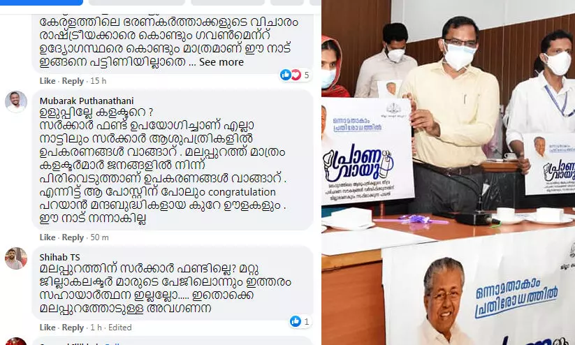 'പ്രാണവായു' പദ്ധതി പ്രഖ്യാപിച്ചുള്ള കലക്ടറുടെ ഫേസ്ബുക്ക് പോസ്റ്റിന് താഴെയാണ് വിമർശനങ്ങൾ നിറയുന്നത്. ആദ്യഘട്ടത്തില് 20 കോടി രൂപ വില വരുന്ന മെഡിക്കല് ഉപകരണങ്ങള് ആശുപത്രികളില് ലഭ്യമാക്കാൻ പൊതുജനങ്ങളിൽ നിന്ന് പണം സമാഹരിക്കുമെന്നാണ് കലക്ടർ അറിയിച്ചത്.