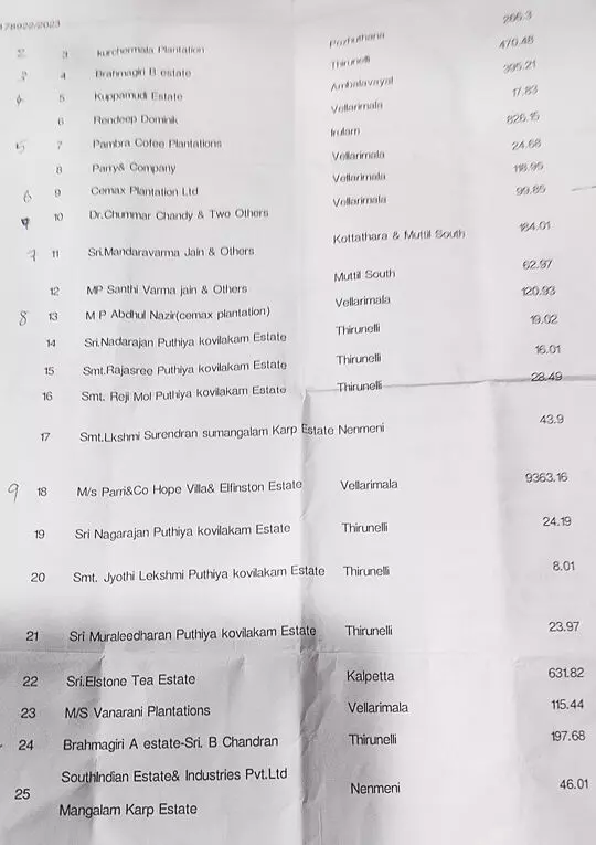 കൽപ്പറ്റ എൽസ്റ്റോൺ ടീ എസ്റ്റേറ്റ്-631, തിരുനെല്ലി ബ്രഹ്മഗിരി എ എസ്റ്റേറ്റ്-(ബി ചന്ദ്രൻ)-197, വെളരിമല, മേമുവെട്ടി എസ്റ്റേറ്റ് ഇംഗ്ലീഷ് ആൻഡ് സ്കോട്ടിഷ് കോ ഓപറേറ്റീവ് ഹോൾ സെയിൽ സൊസൈറ്റി ലിമിറ്റഡ്-195, തിരുനെല്ലി ബ്രഹ്മഗിരി എ ആൻഡ് സി എസ്റ്റേറ്റ് - 476, വെള്ളരിമല മപ്പാടി വയനാട് ടീ കമ്പനി-948, ചോയിമല എസ്റ്റേറ്റ് (ഈസ്റ്റിന്ത്യ ടീ ആൻഡ് പ്രൊഡ്യൂസ് കമ്പനി)-268, വെള്ളരിമല എസ്റ്റേറ്റ് (ഈസ്റ്റിന്ത്യ ടീ ആൻഡ് പ്രൊഡക്സ്)-332,