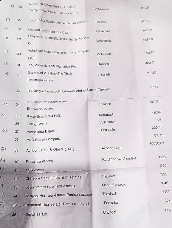 തിരുനെല്ലി പി.വി.എസ് പ്ലാന്റേഷൻ -422, ബ്രഹ്മഗിരി എ എസ്റ്റേറ്റ് -197, ബ്രഹ്മഗിരി എസ്റ്റേറ്റ്- 197, കോട്ടപ്പടി കടൂർ എസ്റ്റേറ്റ്(എച്ച്.എം.എൽ)-411, ചുണ്ടേൽ വേങ്ങക്കോട്ട എസ്റ്റേറ്റ്-329, ജി റൊമാലി കമ്പനി-810, അച്ചൂരാനം ഹാരിസൺസ് അച്ചൂർ എസ്റ്റേറ്റും മറ്റുള്ളവരും- 30,658, കോട്ടപ്പടി, ചുണ്ടേൽ പോഡാർ തോട്ടം- 1323, എൻ.എസ്.എസ് എസ്റ്റേറ്റ്-1250, തവിഞ്ഞാൽ, ചിറക്കര എസ്റ്റേറ്റ് (പാരിസൺ എസ്റ്റേറ്റ്)-1223,
