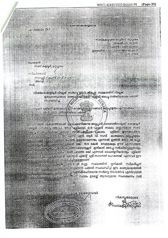 ഷോളയൂർ വില്ലേജിലെ 1816/3ൽ ഉൾപ്പെട്ട സ്ഥലത്തിന് ഭൂനികുതി സ്വീകരിച്ചത് വില്ലേജ് ജീവനക്കാരുടെ ഒത്താശയോടെ ആണെന്ന പരാതിയിന്മേൽ ആർ.ടി.ഒയുടെ കാര്യാലയം അന്വേഷണം നടത്തുന്നുണ്ട്. തർക്ക രഹിതമായ സർവേ 1816/ 2 1817/ 2 എന്നിവയിൽ ഉൾപ്പെട്ട സ്ഥലത്ത് പ്രവേശിക്കുന്നതിന് ഭൂവുടമക്ക് ആവശ്യമായ സംരക്ഷണം നൽകണമെന്നാണ് സബ് കലക്ടർ ധർമലശ്രീയുടെ 2023 ഡിസംബർ 13ന് അഗളി ഡി.വൈ.എസ്.പിക്ക് നൽകിയ ഉത്തരവ്.