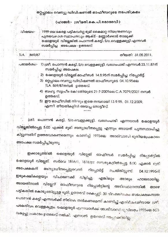 എന്നാൽ, ഒറ്റപ്പാലം മുൻ ആർ.ഡി.ഒ ധർമലശ്രീക്ക് മേട്ടുപ്പാളയം സ്വദേശി മൂത്തമ്മാൾ 2023 ഡിസംബർ ആറിന് പരാതി നൽകി. ഷോളയൂർ വില്ലേജിൽ 1816/2,3, 1817/2 എന്നീ സർവേ നമ്പരുകളിൽ 10.15 ഏക്കർ സ്ഥലം മണ്ണാർക്കാട് സബ് രജിസ്ട്രാർ ഓഫീസിലെ 1967ലെ ആധാര പ്രകാരം മുത്തമ്മാളുടെ പേരിലുള്ളതാണെന്ന് പരാതിയിൽ ചൂണ്ടിക്കാട്ടി. ഇതിൽ സർവേ 1816/3 ൽ ഉൾപ്പെട്ട 2.49 ഹെക്ടർ സ്ഥലത്തിന് വെള്ളകുളം ഊരിലെ രങ്കി വില്ലേജ് ജീവനക്കാരുടെ ഒത്താശയോടെ ഭൂനികുതി അടച്ചു. അതിനെ തുടർന്ന് ഈ സ്ഥലം രങ്കി കൈയേറിയിരിക്കുകയാണ്. മുത്തമ്മാൾക്ക് വേണ്ടി മുക്ത്യാർ ഏജന്റ് സദാനന്ദ രംഗരാജ് ആണ് പരാതി നൽകിയതെന്നും ധർമലശ്രീയുടെ ഉത്തരവിൽ പറയുന്നു.