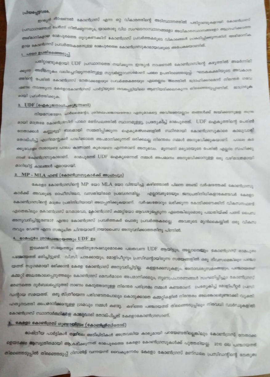 കേരള കോൺഗ്രസിനെ ഏത് വിധേനയും തകർക്കണമെന്ന നിർദേശവുമായാണ് കോൺഗ്രസ് പ്രവർത്തകർക്കിടയിൽ കത്ത് പ്രചരിപ്പിക്കപ്പെട്ടത്. കോൺഗ്രസിെൻറ കഴുത്തിൽ അമർന്നിരിക്കുന്ന അടിമ നുകം വലിച്ചെറിയുന്നതിനുള്ള സുവർണ്ണാവസരമാണ് പാലാ ഉപതെരഞ്ഞെടുപ്പെന്ന് ഒാർമ്മിപ്പിച്ചുകൊണ്ടാണ് കത്ത് തുടങ്ങുന്നത്. കോൺഗ്രസുകാരെ നിരന്തരം ദ്രോഹിക്കുന്ന കേരള കോൺഗ്രസിെൻറ ശവപ്പെട്ടിയിൽ ആണിയടിക്കാനാവുന്ന തെരഞ്ഞെടുപ്പാണിതെന്നും കത്ത് ഓർമ്മപ്പെടുത്തുന്നു.രാമപുരത്ത് യു.ഡി.എഫ്. ഐക്യം എന്നത് അപമാനം സഹിക്കാൻ മാത്രമുള്ള വഴിയായി മാറിയിരിക്കുന്നു. കോൺഗ്രസ് പ്രവർത്തകർ ആവശ്യപ്പെടുന്ന പദ്ധതികൾക്കൊന്നും എം.എൽ.എ. ഫണ്ടോ എം.പി. ഫണ്ടോ ലഭിക്കാറില്ല. പഞ്ചായത്ത് തെരഞ്ഞെടുപ്പിൽ പല വാർഡുകളിലും കോൺഗ്രസ് സ്ഥാനാർത്ഥികളെ കാലുവാരി തോൽപ്പിച്ചത് കേരള കോൺഗ്രസാണ്. കോൺഗ്രസിന് പഞ്ചായത്ത് പ്രസിഡൻറ് സ്ഥാനം കിട്ടിയപ്പോഴൊന്നും ഭരിക്കാൻ സമ്മതിച്ചില്ല. കള്ളക്കേസും സമരവുമായി ഭരണം കുളംതോണ്ടും.