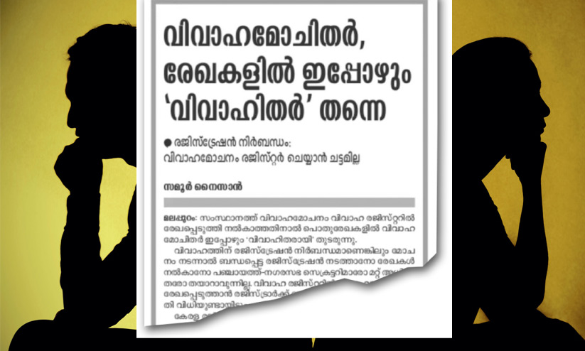 വിവാഹമോചനം രജിസ്റ്ററിൽ രേഖപ്പെടുത്തി നൽകാത്തതിനാൽ പൊതുരേഖകളിൽ മാത്രം 'വിവാഹിതരായി' തുടരുന്ന സാഹചര്യമുണ്ട്. വിവാഹമോചനം നേടിയതിന് ശേഷം ബന്ധപ്പെട്ട രജിസ്റ്ററിൽ രേഖപ്പെടുത്തണമെന്നാവശ്യപ്പെട്ട് നിരവധി പരാതികളാണ് പഞ്ചായത്ത് ഡെപ്യൂട്ടി ഡയറക്ടർമാർക്കും തദ്ദേശഭരണ വകുപ്പിനും ലഭിച്ചത്.