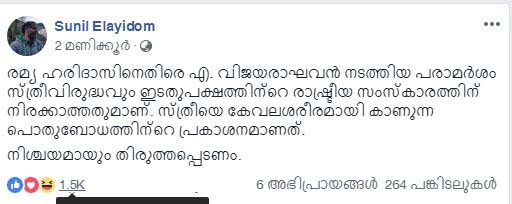 കൊച്ചി: രമ്യ ഹരിദാസിനെതിരെ എൽ.ഡി.എഫ് കൺവീനർ എ. വിജയരാഘവൻ നടത്തിയ പരാമർശത്തിനെതിരെ ഇടതുചിന്തകനും പ്രഭാഷകനുമായ സുനിൽ പി.ഇളയിടം രംഗത്ത്. ഫേസ്ബുക്കിലൂടെയാണ് അദ്ദേഹം തെൻറ പ്രതിഷേധം വ്യക്തമാക്കിയത്. വിജയരാഘവൻ നടത്തിയ പരാമർശം സ്ത്രീവിരുദ്ധവും ഇടതുപക്ഷത്തിെൻറ രാഷ്ട്രീയ സംസ്കാരത്തിന് നിരക്കാത്തതുമാണെന്ന് അദ്ദേഹം വിമർശിച്ചു.