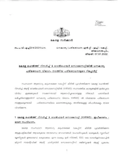 കെ.എച്ച്.ആർ.ഡബ്ല്യു.എസ് എം.ഡി കണക്കില്ലാതെ ചെലവഴിച്ച തുക തിരിച്ചുപിടിക്കണമെന്ന് റിപ്പോർട്ട്