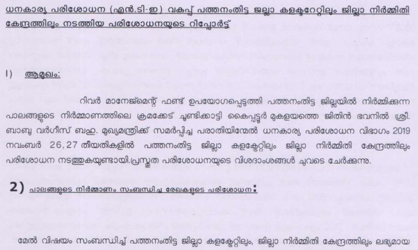 2015ൽ പ്രോജക്ട് തയ്യാറാക്കുമ്പോൾ ഒമ്പത് പാലങ്ങളുടെ നിർമ്മാണത്തിന് ആകെ കണക്കാക്കിയ തുക 23.57 കോടി ആയിരുന്നു. സാങ്കേതിക അനുമതി ഉത്തരവിലെ സമ്മറിയിൽ അത് 28.69 കോടി ആയി ഉയർന്നു. ഇവ തമ്മിൽ 5.12 കോടിയുടെ വ്യത്യാസമുണ്ടായി. ഇതിനു പുറമെ ഇലക്ട്രിക്കൽ ലൈൻ മാറ്റുവാൻ 26,000 രൂപയും റീട്ടെയിനിങ് വാൾ പുനർനിർമ്മിക്കുന്നതിനായി 20.70 ലക്ഷവും വിവിധ കൺസൾട്ടൻസി ചാർജുകളായി 3.07 കോടിയും ഉൾപ്പെടുത്തി. പരിശോധനയിൽ 5.12 കോടി സർക്കാരിന് നഷ്ടം സംഭവിക്കുന്നതിന് കോൺട്രാക്ടർക്ക് ലാഭം ഉണ്ടാക്കുന്നതിനും അതുവഴി നിർമ്മിതി കേന്ദ്രത്തിലെ ജീവനക്കാർ ഉൾപ്പെടെ സർവീസ് ചാർജിനങ്ങളിലും മറ്റും സാമ്പത്തികലാഭം ഉണ്ടാക്കുന്നതിനും ഇടയാക്കിയെന്നാണ് റിപ്പോർട്ടിലെ കണ്ടെത്തൽ. റിവർ മാനേജ്മെൻറ് ഫണ്ട് ക്രമവിരുദ്ധമായി വിനിയോഗച്ചവർക്കെതിരെ നടപടി വേണമെന്നാണ് റിപ്പോർട്ടിലെ ശിപാർശ.