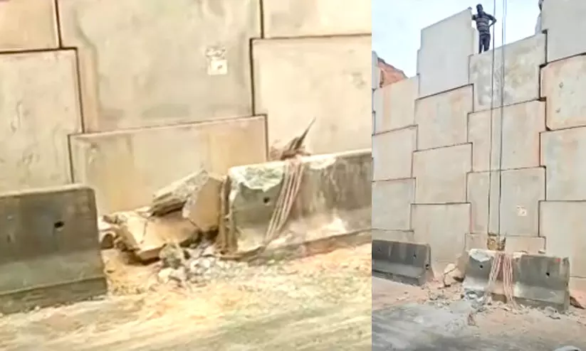 ഒന്നരമീറ്റര് നീളവും വീതിയുമുള്ള കോണ്ക്രീറ്റ് സ്ലാബുകളാണ് ഉയരത്തിൽ മതിൽ പോലെ അടുക്കിവെക്കുന്നത്. നേരത്തെ ഇവിടെ ഇത്തരത്തിലെ മതില് മുന്നോട്ട് തള്ളിവന്നിരുന്നു. തുടര്ന്ന് പൊളിച്ച് വീണ്ടും പണിയുകയായിരുന്നു