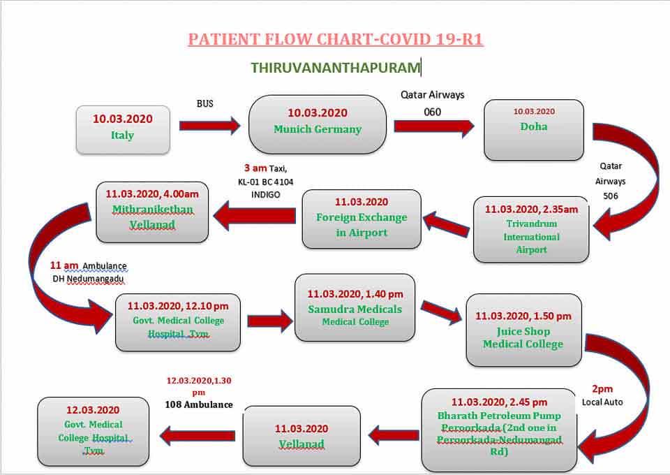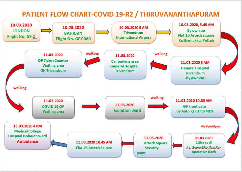 - മാർച്ച് 11ന് രാവിലെ എട്ടിന് തിരുവനന്തപുരം ജനറൽ ആശുപത്രിയിലെ പാർക്കിങ് ഏരിയയിൽ. തുടർന്ന് ഒ.പി ടിക്കറ്റ് കൗണ്ടറിലും കാത്തിരിപ്പ് മേഖലയിലും നടന്നെത്തി. കോവിഡ് 19 കാത്തിരിപ്പ് മേഖലയിലുമെത്തി. പിന്നീട് ഐസൊലേഷൻ വാർഡിലേക്ക്.