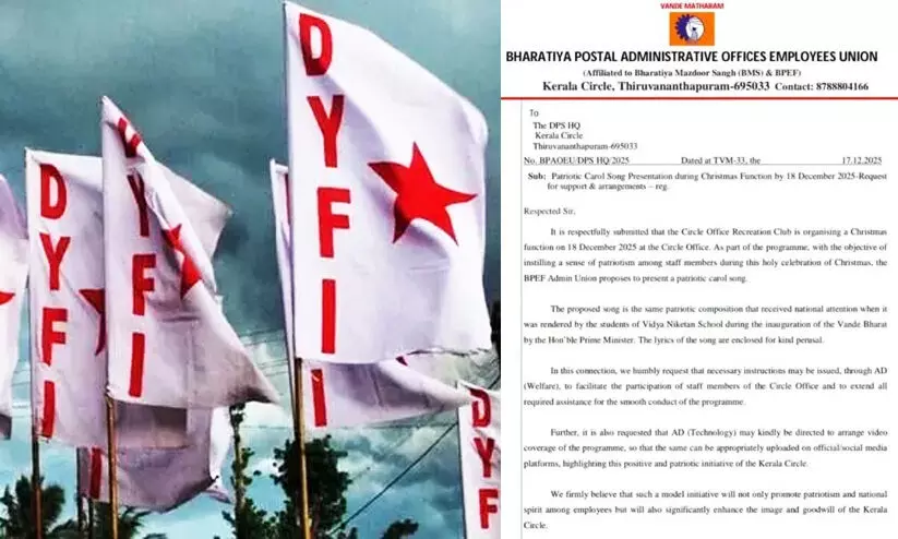 പോസ്റ്റൽ ആസ്ഥാനത്തെ ക്രിസ്മസ് പരിപാടിയിൽ ആർ.എസ്.എസ് ഗണഗീതം; രൂക്ഷ വിമർശനവുമായി ഡി.വൈ.എഫ്.ഐ