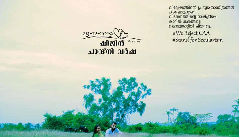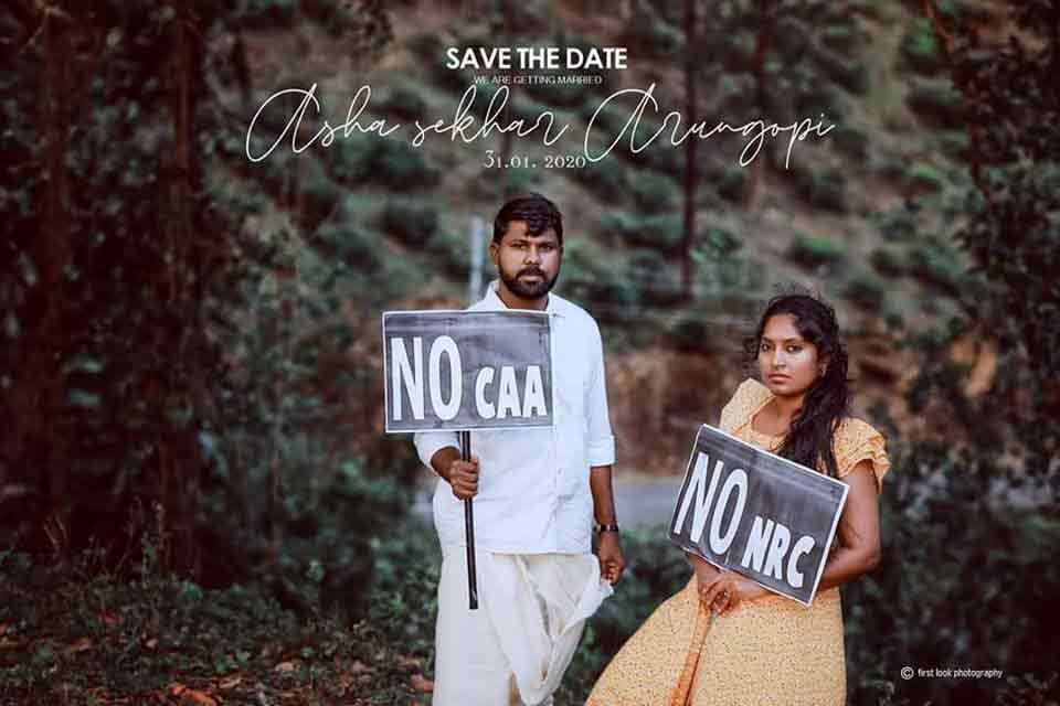 ജനുവരി 31ന് വിവാഹിതരാകുന്ന തിരുവനന്തപുരം ശിശുക്ഷേമ സമിതി ജീവനക്കാരനായ ജി.എൽ. അരുൺ ഗോപിയും കൊല്ലം അഞ്ചൽ സ്വദേശി ആശ ശേഖറും അവതരിപ്പിച്ച സേവ് ദി ഡേറ്റും ഏറെ ശ്രദ്ധിക്കപ്പെട്ടു. അരുൺ നോ സി.എ.എ എന്നെഴുതിയ ബാനറും ആശ നോ എൻ.ആർ.സി എന്നെഴുതിയ ബാനറും പിടിച്ച് ‘വിഭജനത്തിെൻറ പുതിയ കാലത്ത് കൈകോർത്ത് നടക്കുന്നതിനെക്കാൾ വലിയ രാഷ്ട്രീയമില്ല...ഞങ്ങൾ ഒരുമിക്കുന്നു’ എന്ന അടിക്കുറിപ്പോടെ പങ്കുവെച്ച സേവ് ദ ഡേറ്റ് ഫോട്ടോ സമൂഹമാധ്യമങ്ങളിൽ വൈറലായി കഴിഞ്ഞു.