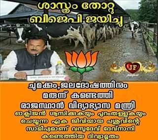 മുമ്പ് മനുഷ്യനിലെ ജീനുകൾ പശുക്കളിലുമുള്ളതായി കേന്ദ്ര ആഭ്യന്തര മന്ത്രി രാജ്നാഥ് സിങ്ങും ഗോമൂത്രവും ചാണകവും തേച്ചാൽ ക്ലിയോപാട്രയെപോലെ സുന്ദരിയാവാമെന്ന് ഗുജറാത്തിലെ പശു സംരക്ഷണ ബോഡും പറഞ്ഞിരുന്നു.