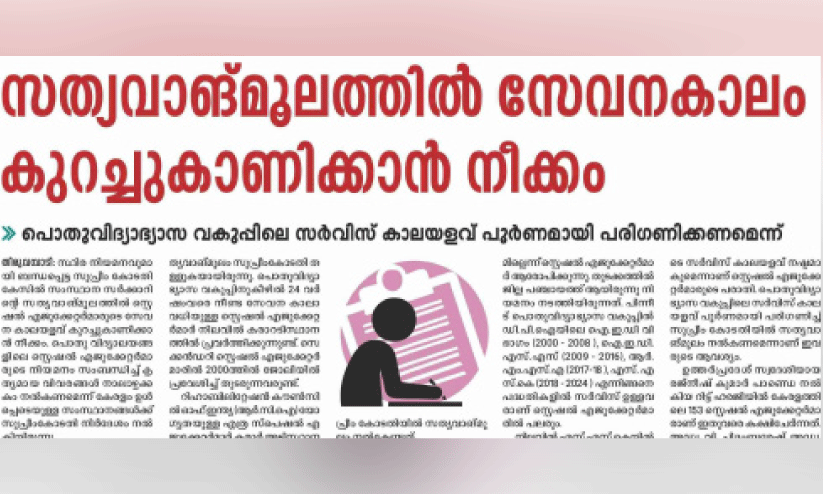 text_fieldsതിരുവമ്പാടി (കോഴിക്കോട്): സംസ്ഥാനത്തെ സ്പെഷൽ എജുക്കേറ്റർമാരുടെ സ്ഥിര നിയമന കേസിൽ സുപ്രീം കോടതിയിൽ സർക്കാർ നൽകുന്ന സത്യവാങ്മൂലത്തിൽ പൊതുവിദ്യാഭ്യാസ വകുപ്പിലെ സേവനകാലം പൂർണമായി ഉൾപ്പെടുത്താൻ നിർദേശം. സമഗ്ര ശിക്ഷ കേരള (എസ്.എസ്.കെ) സ്റ്റേറ്റ് പ്രോഗ്രാം ഓഫിസർ വൈ.എസ്. ഷൂജ ഇതു സംബന്ധിച്ച നിർദേശം 14 ജില്ല പ്രോഗ്രാം കോഓഡിനേറ്റർമാർക്കും നൽകി. എസ്.എസ്.എ, ആർ.എം.എസ്.എ, എസ്.എസ്.കെ സേവന കാലാവധി മാത്രം പരിഗണിക്കാൻ സ്റ്റേറ്റ് പ്രോഗ്രാം ഓഫിസർ കഴിഞ്ഞ വെള്ളിയാഴ്ച നൽകിയ നിർദേശം വിവാദമായിരുന്നു. സത്യവാങ്മൂലത്തിൽ സേവന കാലാവധി കുറച്ച് കാണിക്കാനുള്ള നീക്കം സംബന്ധിച്ച് ‘മാധ്യമം’ വാർത്ത പ്രസിദ്ധീകരിച്ചിരുന്നു.