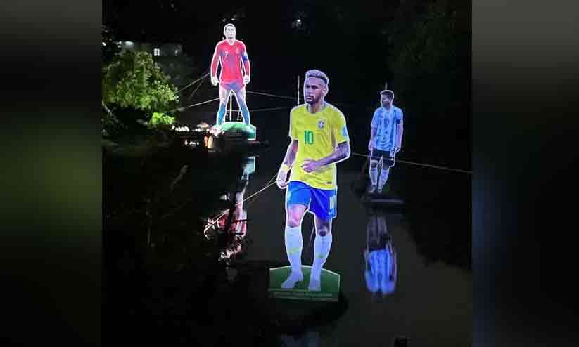പുള്ളാവൂര് പുഴയില് 30 അടി പൊക്കമുള്ള മെസ്സിയുടെ കട്ടൗട്ടാണ് ആദ്യം സ്ഥാപിച്ചത്. ഇത് അന്താരാഷ്ട്ര മാധ്യമങ്ങളിലടക്കം വാര്ത്തയായതോടെ വൈറലായി. അര്ജന്റീന ആരാധകര് പുഴയുടെ നടുവിലെ തുരുത്തിലായിരുന്നു കട്ടൗട്ട് വെച്ചത്. ഇതിന് പിന്നാലെ ബ്രസീല് ആരാധകരെത്തി 40 അടി വലുപ്പമുള്ള നെയ്മറിന്റെ കട്ടൗട്ട് പുഴക്കരയില് വെച്ചു. കഴിഞ്ഞ ദിവസം പോര്ച്ചുഗല് ആരാധകര് ക്രിസ്റ്റ്യാനോ റൊണാള്ഡോയുടെ 50 അടി ഉയരമുള്ള കട്ട് ഔട്ട് കൂടി സ്ഥാപിച്ചു.