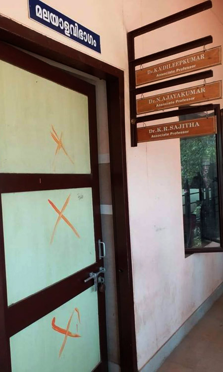 text_fieldsകാലടി: ശബരിമല വിഷയത്തിൽ സംസ്ഥാന സർക്കാർ നിലപാടിനെ പിന്തുണച്ച് വിവിധ വേദികളിൽ പ്രഭാഷണം നടത്തുന്ന ഡോ. സുനിൽ പി. ഇളയിടത്തിെൻറ ഒാഫിസിൽ സംഘ്പരിവാർ അതിക്രമം. നേരത്തേ ഹൈന്ദവ സംഘടനകൾ അദ്ദേഹത്തിനെതിരെ വധഭീഷണി മുഴക്കിയിരുന്നു. ശ്രീശങ്കരാചാര്യ സംസ്കൃത സർവകലാശാല മലയാളവിഭാഗം മേധാവിയും വാഗ്മിയും എഴുത്തുകാരനുമായ ഡോ. സുനിൽ പി. ഇളയിടത്തിെൻറ സർവകലാശാലയിലെ ഓഫിസ് വാതിലിലാണ് ബുധനാഴ്ച രാത്രി അജ്ഞാതർ കാവി നിറത്തിൽ മൂന്ന് ഗുണനചിഹ്നം വരക്കുകയും നെയിംബോർഡ് എടുത്തുമാറ്റുകയും ചെയ്തത്.