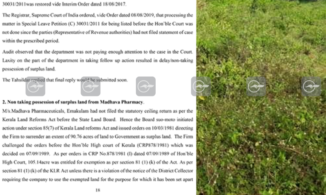 2009 സെപ്തംബർ ഏഴിന് മിച്ചഭൂമി സംബന്ധിച്ച് റിപ്പോർട്ട് സമർപ്പിച്ചു. ഈ കേസിൽ കോടതിയുടെ അന്തിമ ഉത്തരവുണ്ടായത് 2018 മാർച്ച് 12നാണ്. തുടർന്ന് ഹരജിക്കാരന് നൽകിയ ഇളവ് കാലഹരണപ്പെട്ടതിനാൽ താലൂക്ക് ലാൻഡ് ബോർഡിനോട് നോട്ടീസ് നൽകാൻ നിർദേശിച്ചു. ഒറ്റപ്പാലം താലൂക്ക് ലാൻഡ് ബോർഡ് ചെയർമാൻ, തഹസിൽദാർ, ഔഷധത്തോട്ടത്തിലെ വിദഗ്ധരുമായി ചേർന്ന് മിച്ചഭൂമി സർവേ ചെയ്യണമെന്ന് തീരുമാനിച്ചു. എന്നാൽ, തുടർനടപടികളൊന്നും സ്വീകരിച്ചില്ല. അതിനിടയിൽ ഈ ഭൂമിയിലെ നിരവധി മരങ്ങൾ വെട്ടി കടത്തുകയും ചെയ്തു. ഇതു സംബന്ധിച്ച പരാതിയിൽ വില്ലേജ് ഓഫീസർ റിപ്പോർട്ട് നൽകി. താലൂക്ക് ലാൻഡ് ബോർഡ് ചെയർമാൻ, തഹസിൽദാർക്ക് (എൽ.ആർ) എന്നിവരോട് നിയമനടപടി സ്വീകരിക്കാൻ നിർദേശം നൽകി. തുടർന്ന് എന്ത് നടപടി സ്വീകരിച്ചുവെന്നതിന് രേഖകളില്ലെന്ന് ഓഡിറ്റ് ചൂണ്ടിക്കാട്ടുന്നത്.