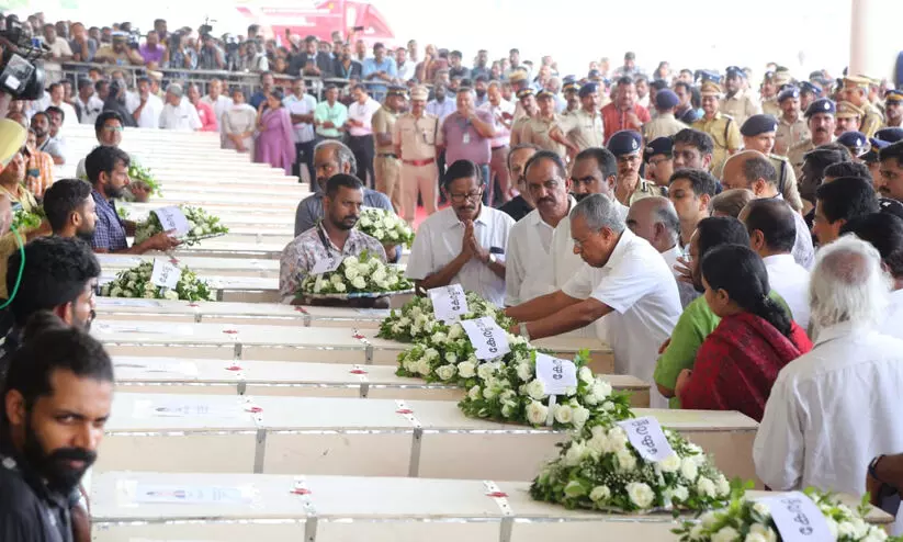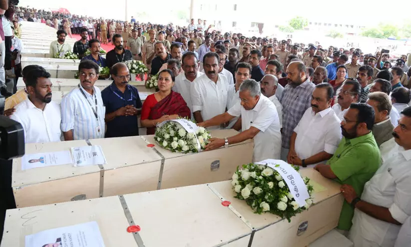 text_fieldsകൊച്ചി: കുവൈറ്റ് ദുരന്തത്തിൽ ജീവൻ പൊലിഞ്ഞവർക്ക് നാടിൻ്റെ അന്ത്യാഞ്ജലി. നാടിനെ നടുക്കിയ തീപിടിത്തത്തിൽ മരിച്ചവർക്ക് മുഖ്യമന്ത്രി പിണറായി വിജയൻ്റെ നേതൃത്വത്തിൽ ആദരാഞ്ജലികളർപ്പിച്ച ശേഷം മൃതദേഹങ്ങൾ ബന്ധുക്കൾക്ക് കൈമാറി. 23 മലയാളികളെ കൂടാതെ തമിഴ്നാട് സ്വദേശികളായ ഏഴു പേരുടെ മൃതദേഹങ്ങൾ തമിഴ് സംസ്ഥാന ന്യൂനപക്ഷ ക്ഷേമ വകുപ്പ് മന്ത്രി സെൻജി മസ്താനും കർണാടക സ്വദേശിയുടെ മൃതദേഹം അവിടെ നിന്നുള്ള ഉദ്യോഗസ്ഥ പ്രതിനിധികളും ചേർന്ന് ഏറ്റുവാങ്ങി.