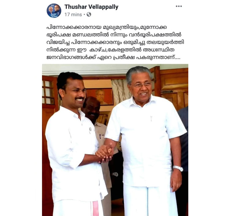 മുഖ്യമന്ത്രിയെയും പ്രശാന്തിനെയും അഭിനന്ദിച്ച് തുഷാറിന്റെ ഫേസ്ബുക്ക് കുറിപ്പ്; വിവാദമായതോടെ വിശദീകരണം
