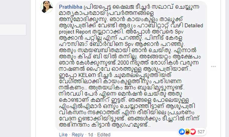 മന്ത്രിയെ അനുമോദിച്ച് തുടങ്ങുന്ന കുറിപ്പിൽ തെൻറ നിരാശയും വേദനയുമാണ് എം.എൽ.എ പങ്കുവെക്കുന്നത്. ‘‘ഞങ്ങൾക്കും ടീച്ചറിൽനിന്ന് അഭിനന്ദനം കിട്ടാൻ ആഗ്രഹമുണ്ട്’’ എന്ന വാചകത്തിലൂടെ വികസനത്തിൽ പക്ഷപാതിത്വ സമീപനം നിലനിൽക്കുന്നുവെന്ന പേരാക്ഷ വിമർശനവും ഉന്നയിക്കുന്നു. കമൻറ് വൈറലായതോടെ മന്ത്രിയുടെ പോസ്റ്റിൽ താനിട്ട കമൻറ് ആരും ആഘോഷിക്കേണ്ടതില്ലെന്ന വിശദീകരണവുമായി എം.എൽ.എ വീണ്ടും ഫേസ്ബുക്കിലെത്തി.