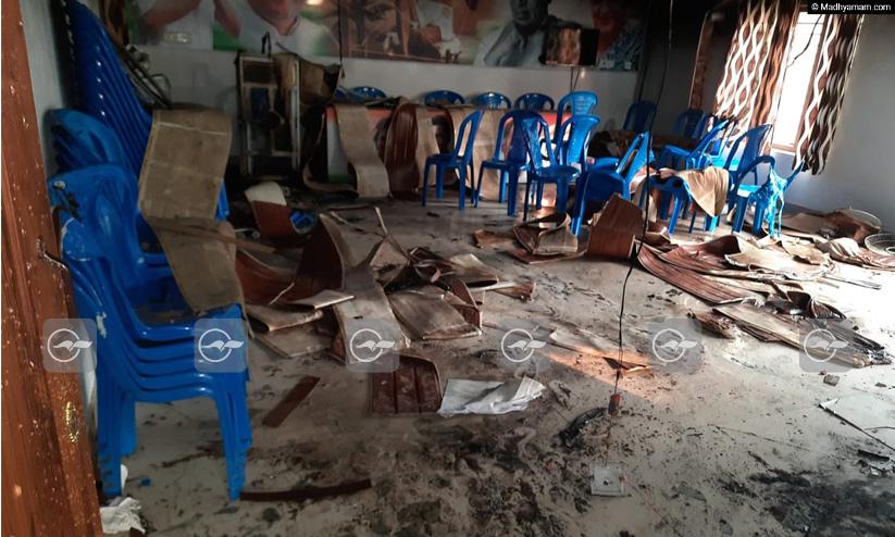 മുകൾ നിലയിലുള്ള കോൺഗ്രസ് ഓഫീസിന്റെ അകത്തു കയറി അടിച്ചു തകർക്കുകയും തീയിടുകയും ചെയ്തു. പുതിയ കെട്ടിടത്തിലെ ഒന്നാം നിലയിൽ പ്രവർത്തിക്കുന്ന ഓഫീസിൻ്റെ ജനവാതിലുകളും സീലിങ്ങും തറയിൽ പതിച്ച ടൈൽസ് ഉൾപ്പെടെ കത്തിനശിച്ചു.