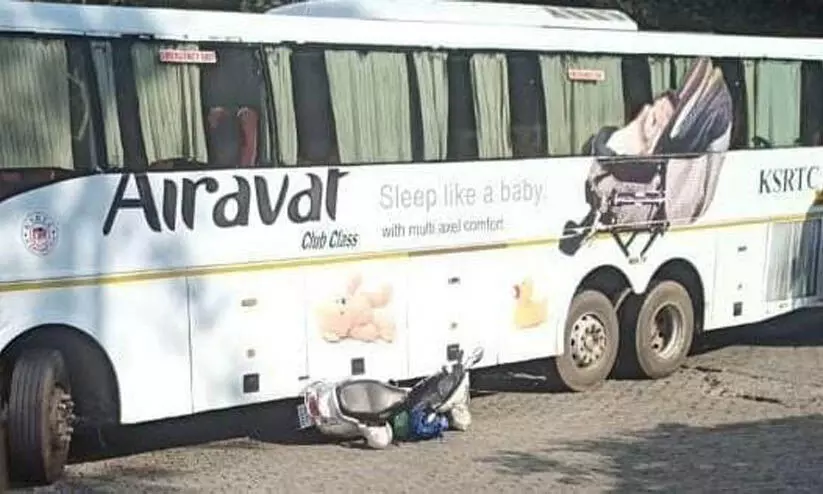 വിദ്യാഭ്യാസ വകുപ്പ് ജീവനക്കാരി സുഷിദക്കാണ് (45) പരിക്കേറ്റത്. വളവ് തിരിയുന്നതിനിടെ ഇവർ സഞ്ചരിച്ച സ്കൂട്ടർ എതിരെ വന്ന കർണാടക ഐരാവത് ബസ്സുമായി കൂട്ടിയിടിക്കുകയായിരുന്നു. ബസ്സിനടിയിൽ കുടുങ്ങിയ യാത്രക്കാരി അത്ഭുതകരമായാണ് രക്ഷപ്പെട്ടത്.